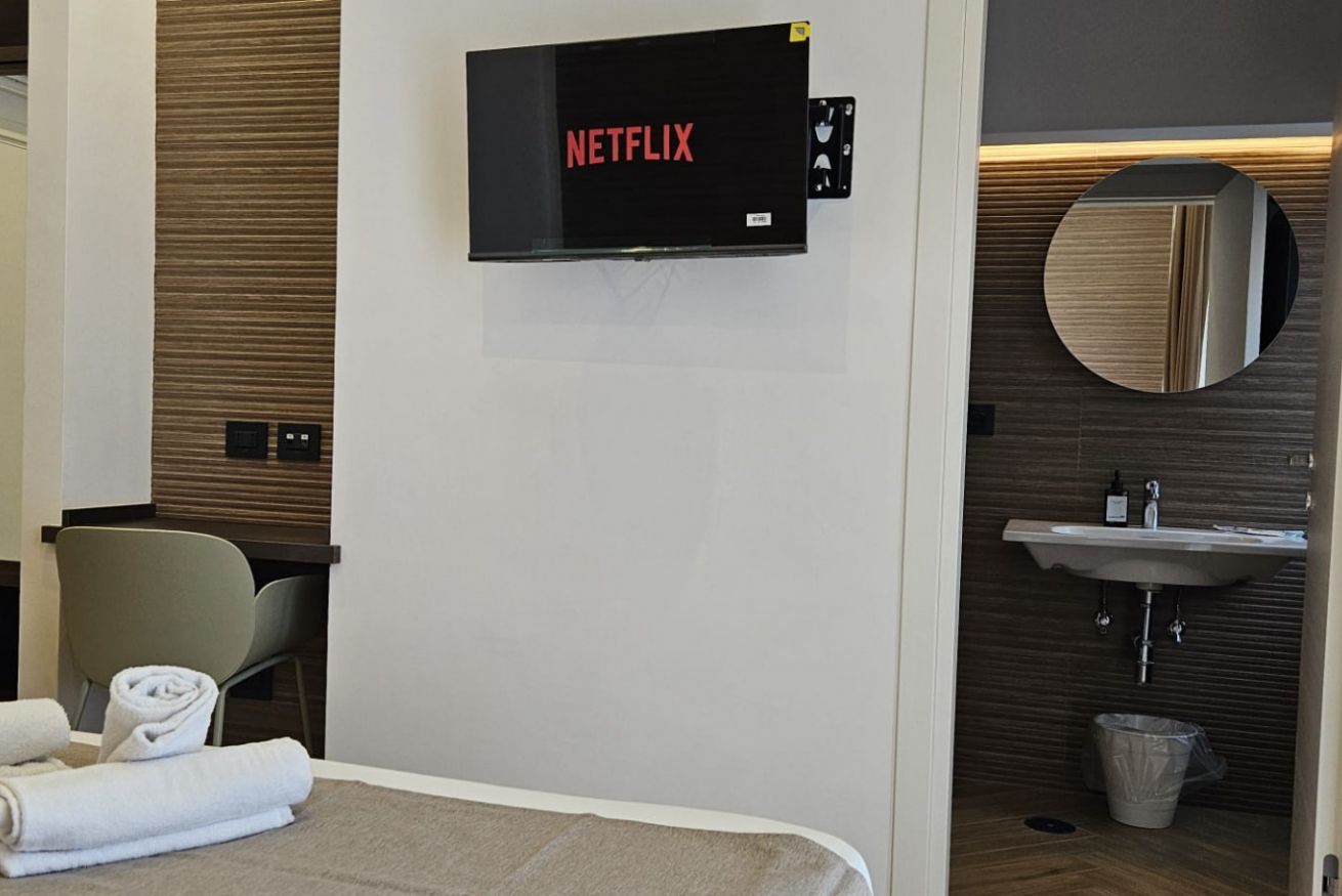 Climatizzata in estate riscaldata in inverno, Macchina caffe, Bollitore set Tè, Smart TV schermo piatto, con finestra interno cortile.